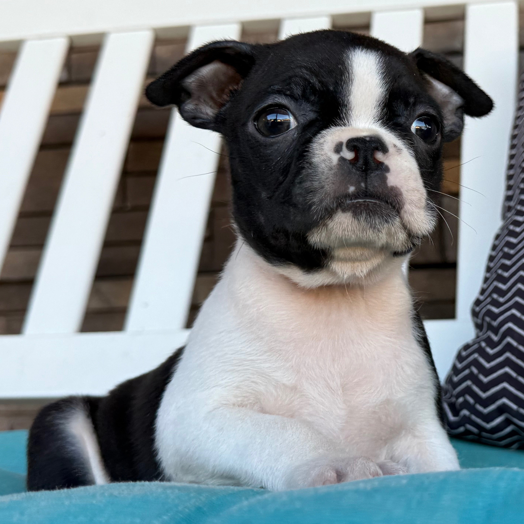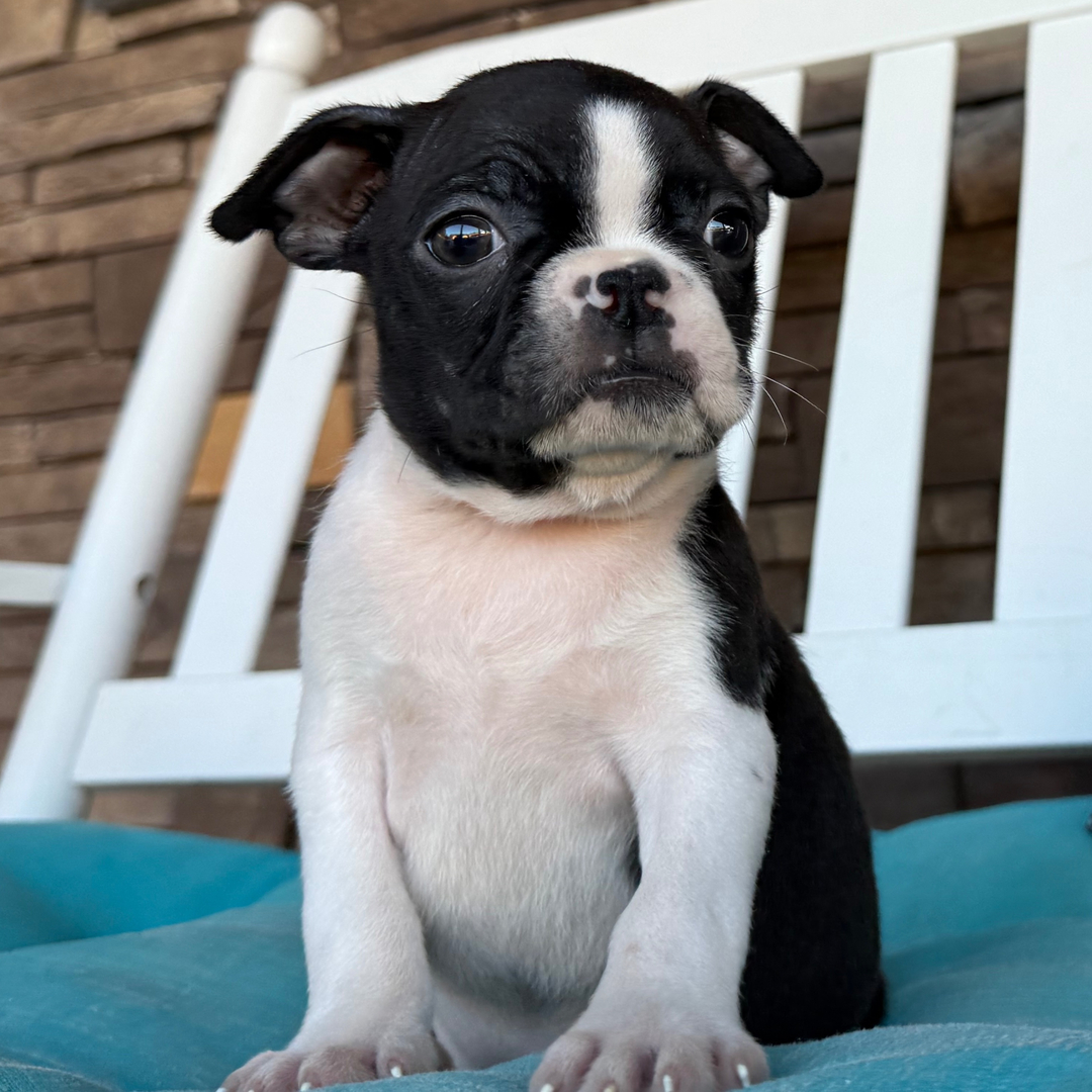 Jag är en 10 veckor gammal bostonterrier-tik med en charmig svartvit päls och ett hjärta fullt av nyfikenhet. Snart är jag redo att resa hem till min nya familj för alltid. Jag är SKK-registrerad, frisk och socialiserad med både människor och andra hundar. När jag blir vuxen kommer jag väga mellan 12–18 lbs, vilket gör mig perfekt för både lägenhet och hus.